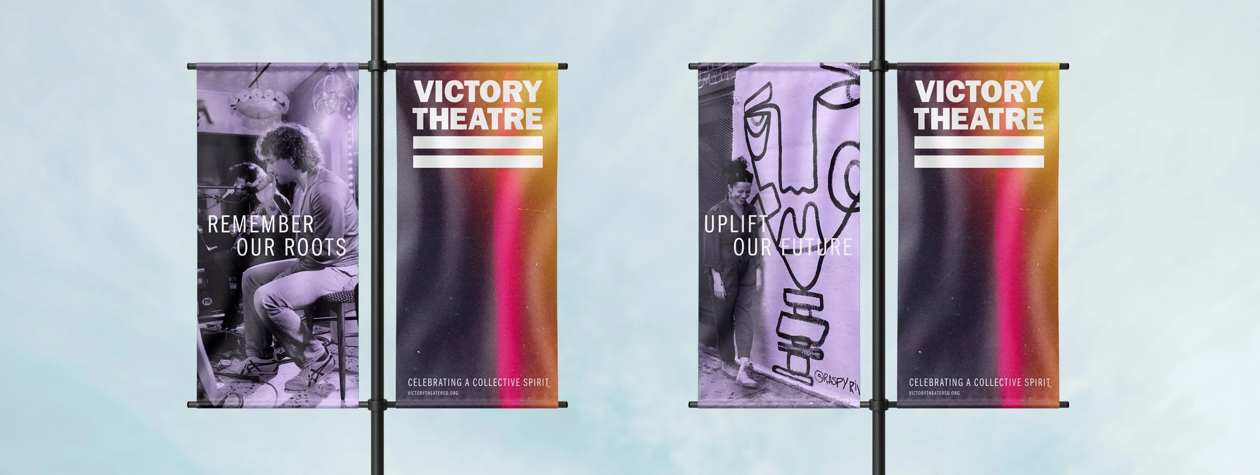 Our typography bridges past and present, combining traditional and modern elements inspired by historical marquees to create a timeless aesthetic that embodies Victory Theatre's spirit.